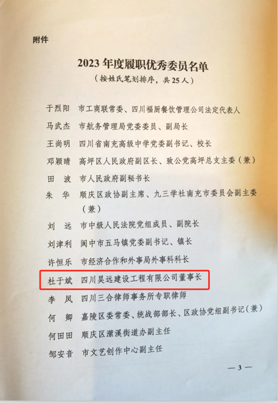 中國人民南充市委員會(huì)政治協(xié)商會(huì)議 南政協(xié)[2024]8號(hào)《政協(xié)南充市委員會(huì)關(guān)于表揚(yáng)2023 年度職優(yōu)秀委員的決定》文件公布 我公司董事長杜于斌被評(píng)為優(yōu)秀政協(xié)委員!這是一份至高無上的榮譽(yù),也是對(duì)他多年來為社會(huì)做出杰出貢獻(xiàn)的高度認(rèn)可。